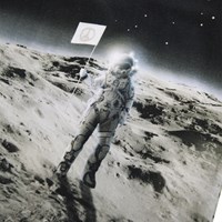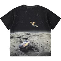 Zwarte t-shirt gemaakt van zacht biologisch katoen met een ribboord rond de hals. Het t-shirt heeft een ruivallende pasvorm met een print van de man op de maan.