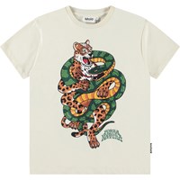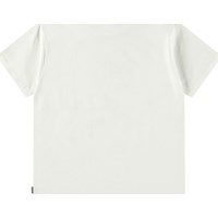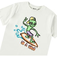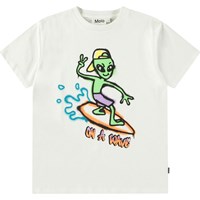 Wit t-shirt van zacht biologisch katoen met korte mouwen en ribboord rond de hals. Het t-shirt heeft een ruimvallende pasvorm en een print op de voorkant van een alien op een surfplank met de tekst 'On a Wave'.