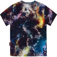 Kleurrijke t-shirt van biologisch katoen met een ronde hals en geribbelde boord rond de hals. Het t-shirt heeft een ruime pasvorm en een all-over print geïnspireerd op een afbeelding van de James Webb Space Telescope die de ruimte laat zien. Als je goed kijkt, kun je misschien wat vrij zwevende satellieten spotten.