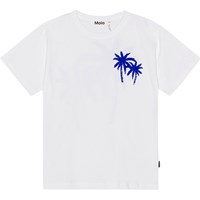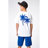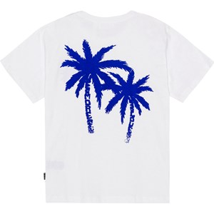 Riley is een witte t-shirt van 100% biologisch katoen. Er staat een kleine blauwe palmbomenprint op de voorkant die op de achterkant in het groot herhaald wordt. Als je van dichtbij kijkt, zie je mogelijk een verborgen 'More Love' bericht. Riley heeft een ronde hals met ribboord en een ruimvallende pasvorm.