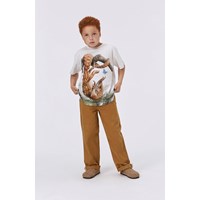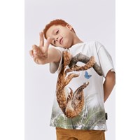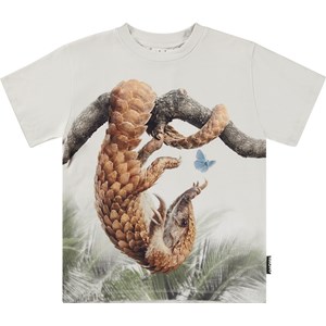 Wit t-shirt met op de voorkant een schubdierprint. Het kleine schubdier hangt ondersteboven aan een tak, terwijl hij een blauwe vlinder begroet. Dit t-shirt is gemaakt van 100% katoen, heeft korte mouwen, een ronde hals met rib en een ruimvallende pasvorm.