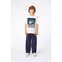Riley is een beige t-shirt van 100% biologisch katoen met een print op de voorkant. op de print staan skaters die stunten in de vallende avond en onder de print staat 'Peace Out' geprint in varsity tekst. Riley heeft een ronde hals met ribboord, een print op de voorkant en een ruimvallende pasvorm.