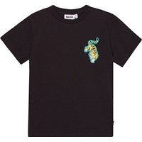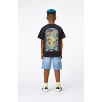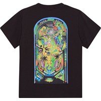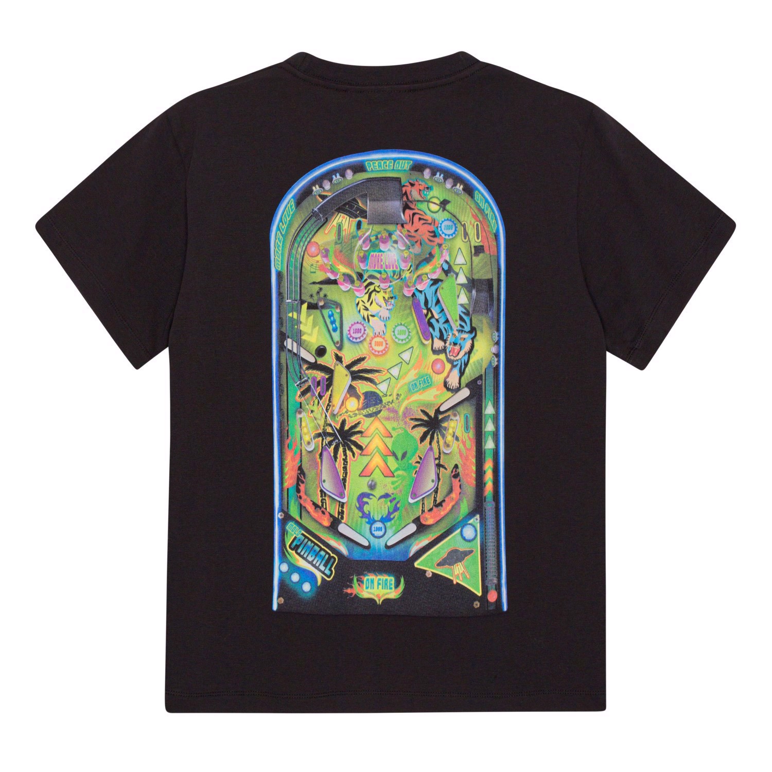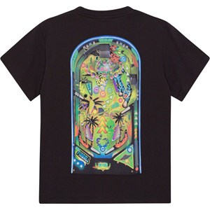 Riley is een zwart t-shirt van 100% biologisch katoen met op de voorkant een print. Er is zoveel te zien op deze flipperkastprint, zoals een bal in een zee van licht, buitenaardsewezens, palmbomen en stoeren tijgers. Riley heeft een ronde hals met ribboord en een ruimvallende pasvorm.