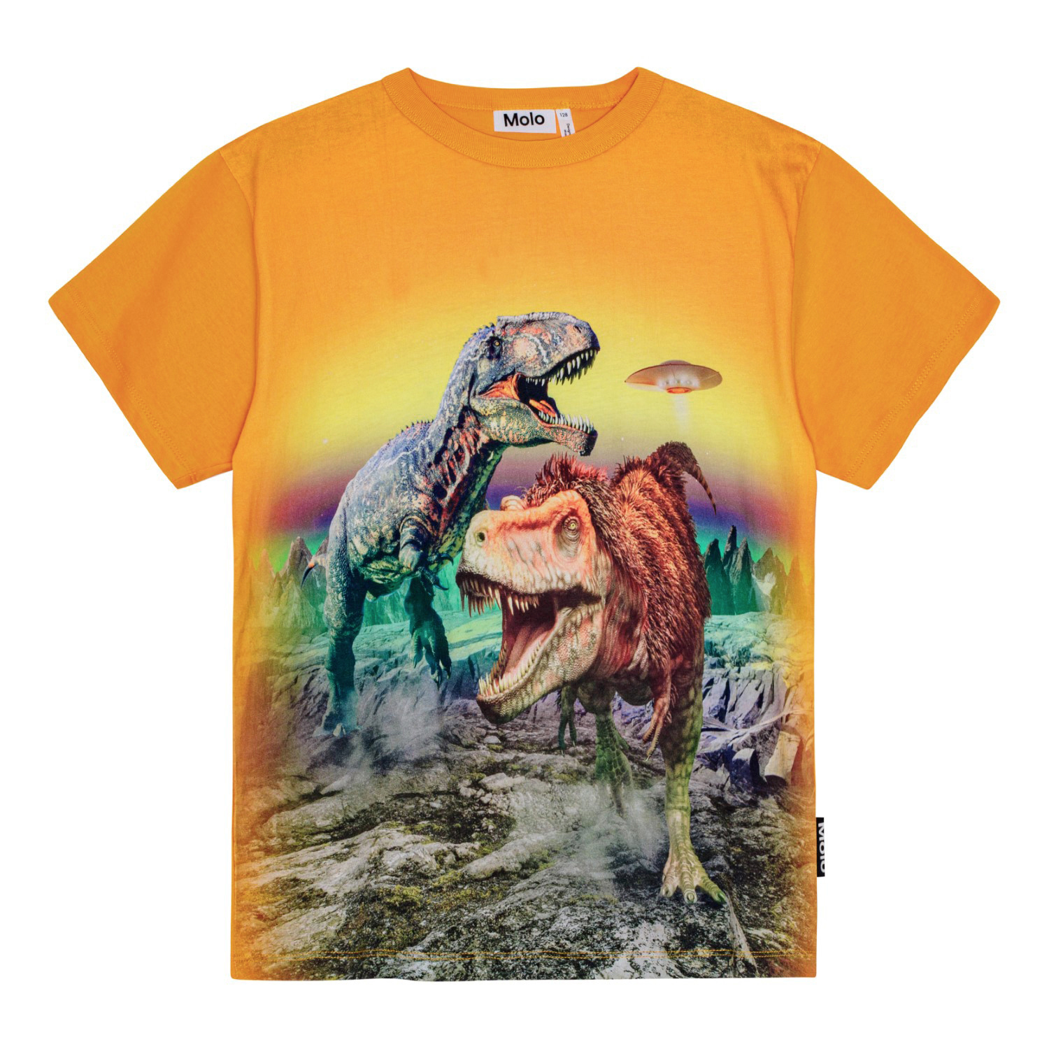 Oranje t-shirt van biologisch katoen met een ronde hals en geribbelde boord rond de hals. Het t-shirt heeft een ruime pasvorm en heeft een veelkleurige print van twee dinosaurussen die tikkertje spelen met een UFO.