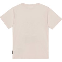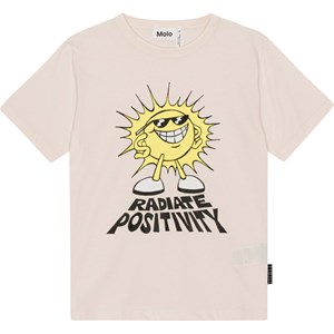 Riley is een lichte naturelkleurige t-shirt van 100% biologisch katoen met een gele print op de voorkant. Het t-shirt heeft een stripachtige print van een zelfverzekerde zon met een brede glimlach die de boodschap 'Radiate Positivity' verspreidt. Riley heeft een ronde hals met ribboord en een ruimvallende pasvorm.
