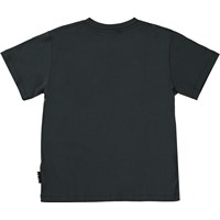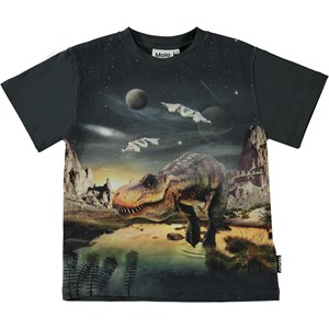 Zwart t-shirt met op de voorkant een print van een dinosaurus en het heelal. De print toont een plek waar het verleden en de toekomst elkaar ontmoeten. In de lucht zie je ruimteschepen, sterren en planeten, terwijl een T-Rex stevig op de grond staat en zijn klauwen in een stil meer dompelt. Misschien bestaat er ergens in de toekomst tijdreizen, zodat we een kleine reis terug in de tijd, naar de Krijt tijdperk, kunnen maken. Dit t-shirt is gemaakt van 100% katoen, heeft korte mouwen, een ronde hals met rib en een ruimvallende pasvorm.