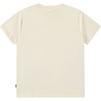 Gebroken wit t-shirt van zacht biologisch katoen met korte mouwen en ribboord rond de hals. Het t-shirt heeft een ruimvallende pasvorm met op de voorkant een print van een UFO die over de jungle in de zonsondergang zweeft.