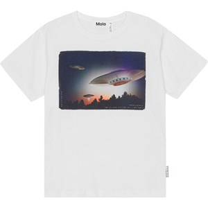 Riley is een witte t-shirt van 100% biologisch katoen met een print. Op de print staat een bezoeker van heel ver weg. Niet een maar drie UFO's lijken te landen aan de rand van het bos. Zijn ze aan het kamperen op Aarde? Riley heeft een ronde hals met ribboord en een ruimvallende pasvorm.