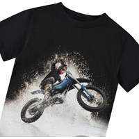 T-shirt van zacht biologisch katoen met korte mouwen en ribboord rond de hals. Het t-shirt heeft een ruimvallende pasvorm en op de voorkant een print van een motorcrosser met opspattend water.