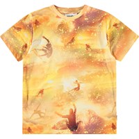 Wit t-shirt van zacht biologisch katoen met korte mouwen en ribboord rond de hals. Het t-shirt heeft een ruimvallende pasvorm en op de voor- en achterkant een print van een surfer op de golven.