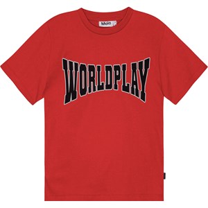 Rood t-shirt van biologisch katoen met een ronde hals en geribbelde boord rond de hals. Het t-shirt heeft een ruime pasvorm en een zwart/witte print op de voorkant. De print bestaat uit de tekst "World Play".