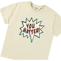 Beige t-shirt van zacht biologisch katoen met korte mouwen en ribboord rond de hals. Het t-shirt heeft een ruimvallende pasvorm met op de voorkant een kleurrijke print van een tekstballon met de tekst 'You Matter'.