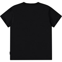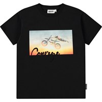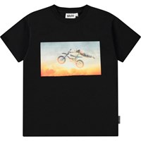 T-shirt van zacht biologisch katoen met korte mouwen en ribboord rond de hals. Het t-shirt heeft een ruimvallende pasvorm en op de voorkant een print van een vliegende motorcrosser.
