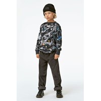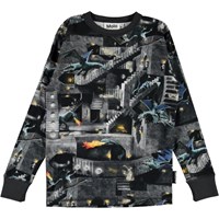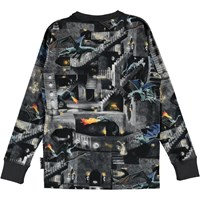 Rill is een trui met een print van daken in een computerspel. Rill heeft een donkergrijze boord rond de hals en rib rond de mouwen.