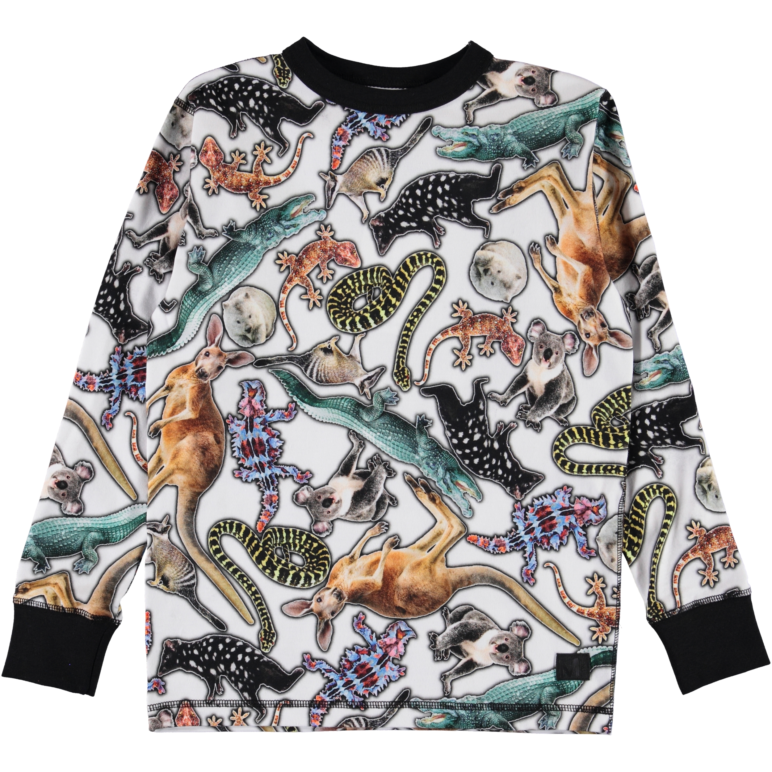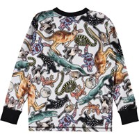 Rill is een wit shirt met lange mouwen en een print van wilde dieren in Australië. Rill heeft zwarte ribboord rond de mouwen en hals.