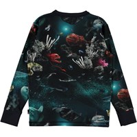 Duik onder het oceaanoppervlak en kijk wat er verborgen zit in de print op het Rill shirt. Er zijn veel verschillende vissen en misschien wel een haai. Rill is een blauw shirt met lange mouwen en een donkerblauwe boord rond de hals en mouwen.