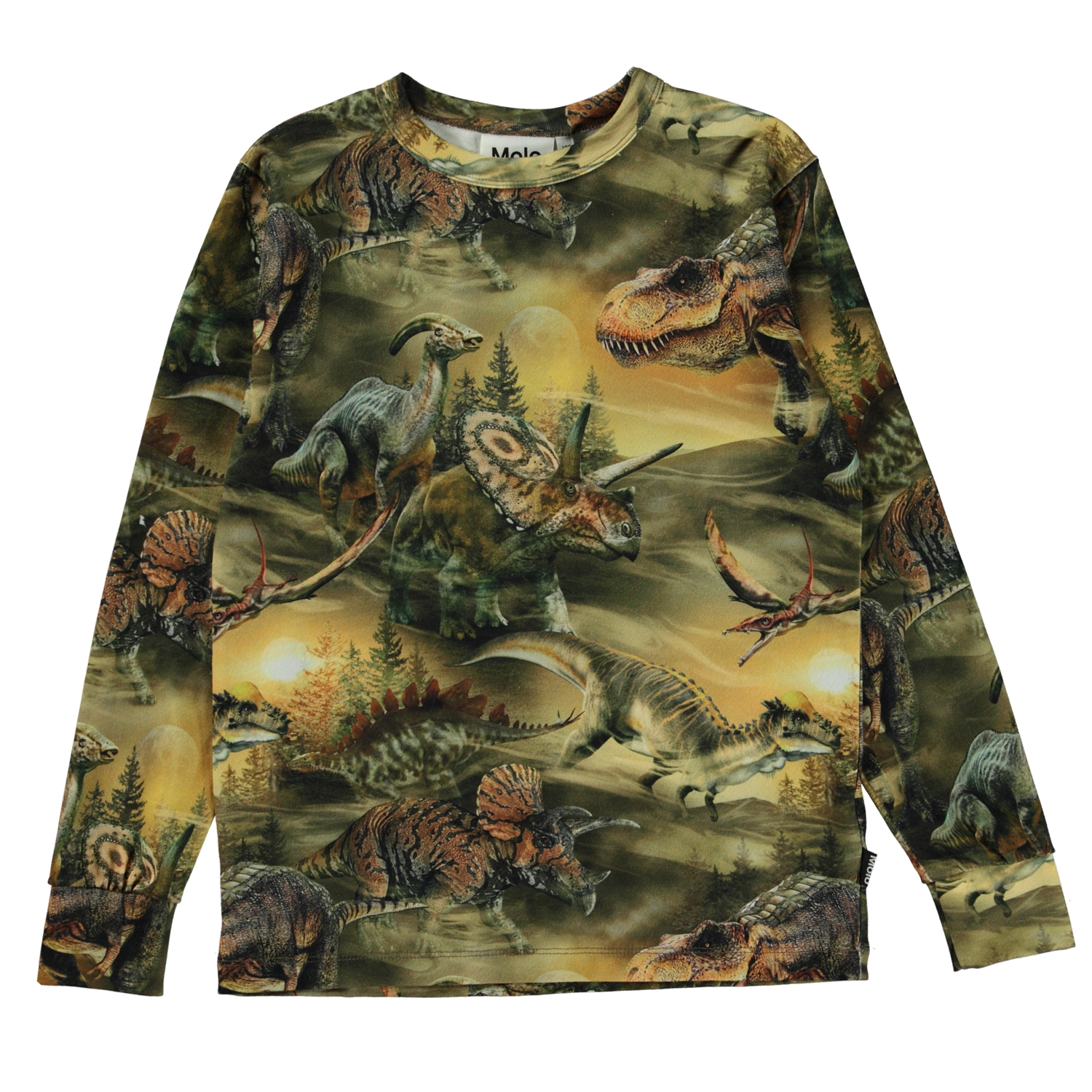 Groene longsleeve in een dinosaurus print. De print laat veel verschillende dinosaurussen zien, die in de ochtendmist ronddwalen in de zandduinen. De omtrek van de maan hangt over hen heen en herinnert hen eraan dat ze deel uitmaken van iets groters. Deze longsleeve is gemaakt van 100% katoen, heeft een ronde hals met ribboord en ribboord aan de mouwen. Het heeft een normale pasvorm.