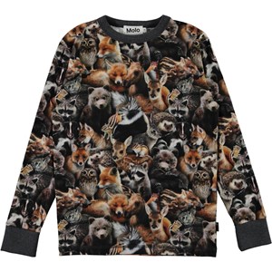 Rill is een shirt met lange mouwen met een print van een groep bosdieren. Kun je de beren en egels spotten of misschien een dier dat je niet kent? Rill heeft een donkergrijze boord rond de hals en mouwen.