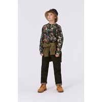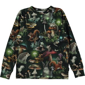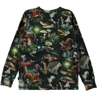 Zwarte longsleeve met een print. De print legt een rustig en gezellig moment in de schemering van het bos vast, waar kleine knaagdieren en andere kleine diertjes tussen de paddenstoelen rondlopen, verlicht door lichtgevende paddenstoelen. De lichtgevende paddenstoelen werken als kleine lampjes op de bodem van het donkere bos. Deze longsleeve is gemaakt van 100% katoen, heeft een ronde hals met ribboord en ribboord aan de mouwenen. Het heeft een normale pasvorm.