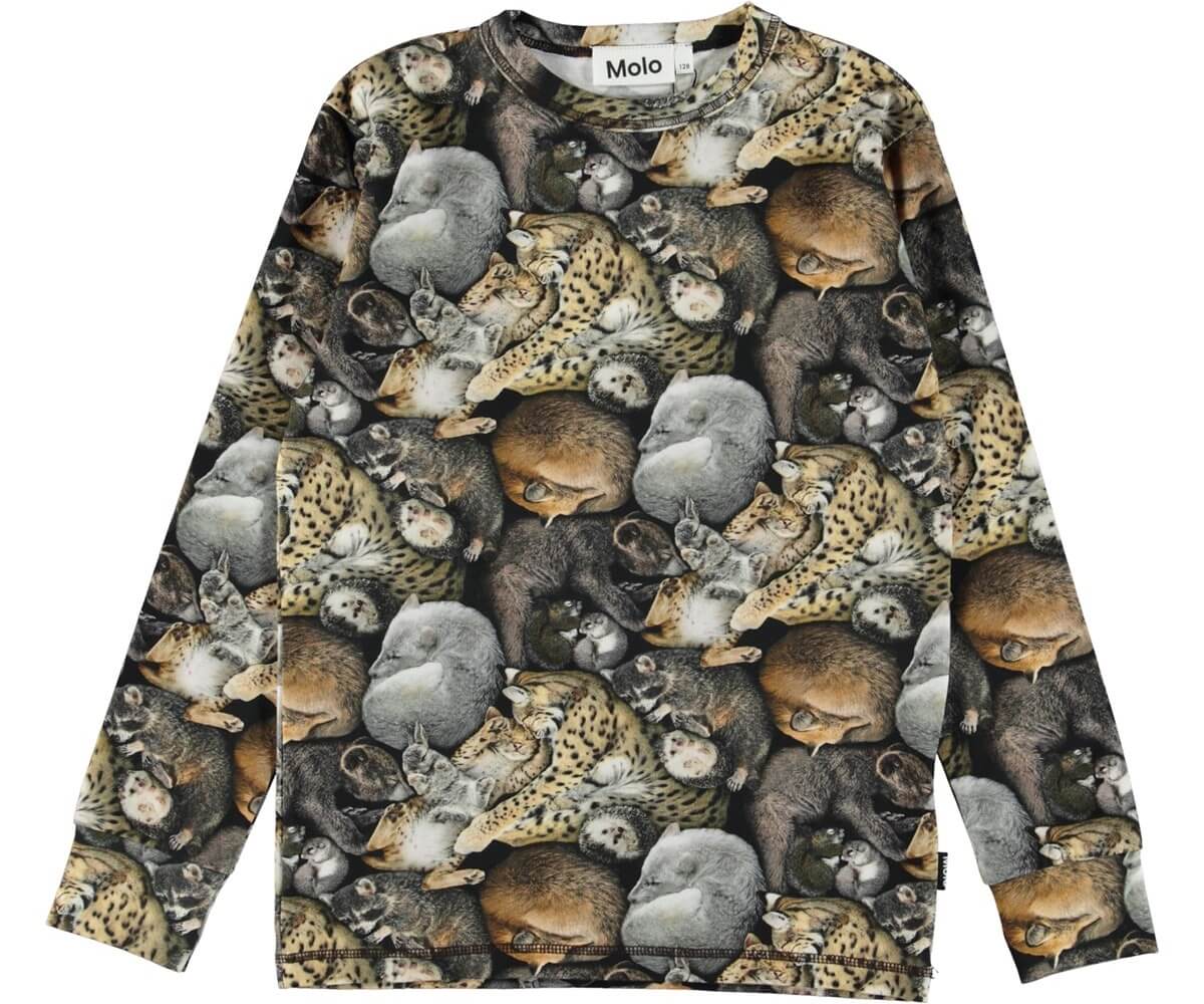 Rill is een longsleeve met een print van veel verschillende dieren die samen in winterslaap zijn. De longsleeve heeft een grijze ribboord rond de hals en mouwen.