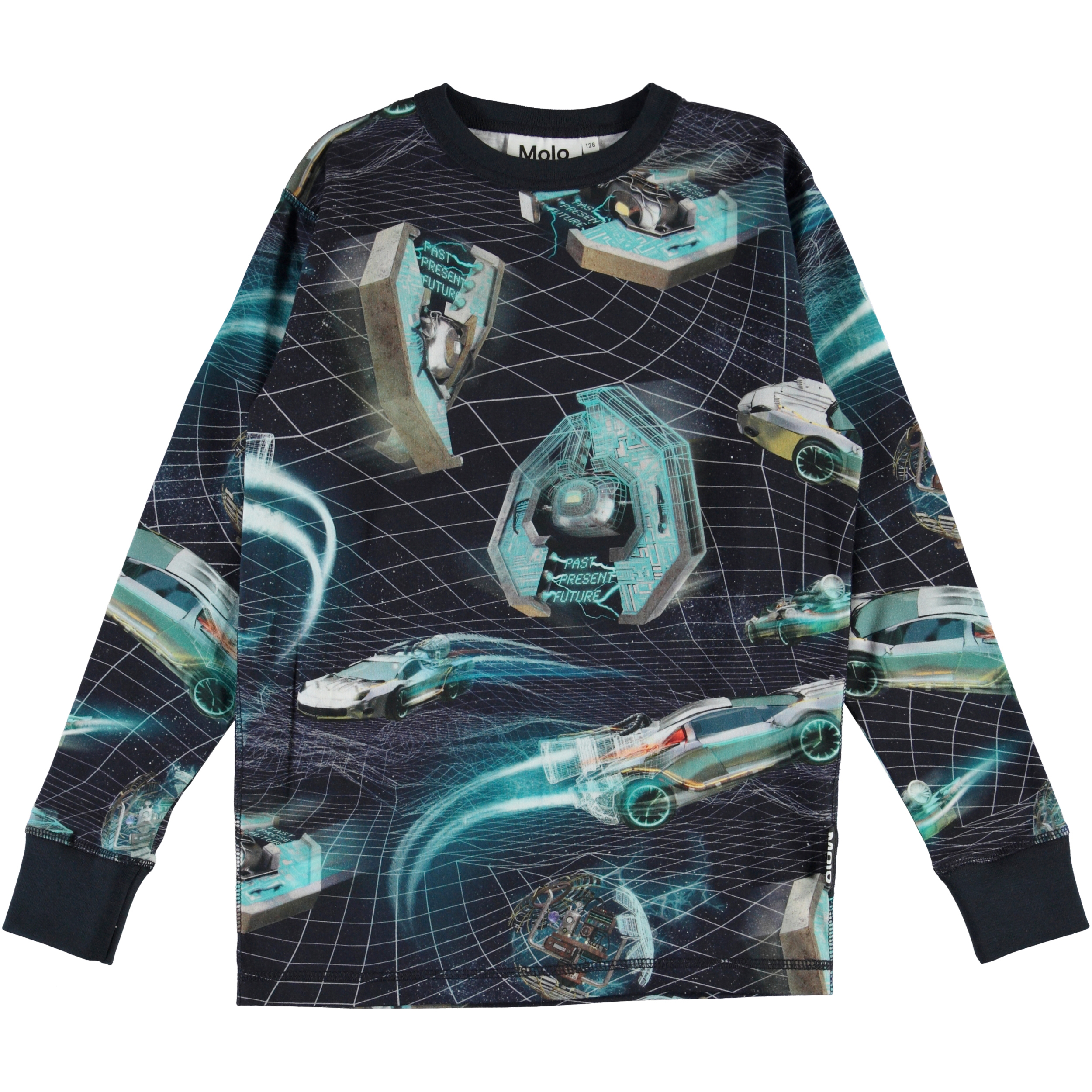 Rill is een blauwe trui met de 'Time Machine’ print. Rill heeft een donkerblauwe boord rond de hals en donkerblauwe rib rond de mouwen.