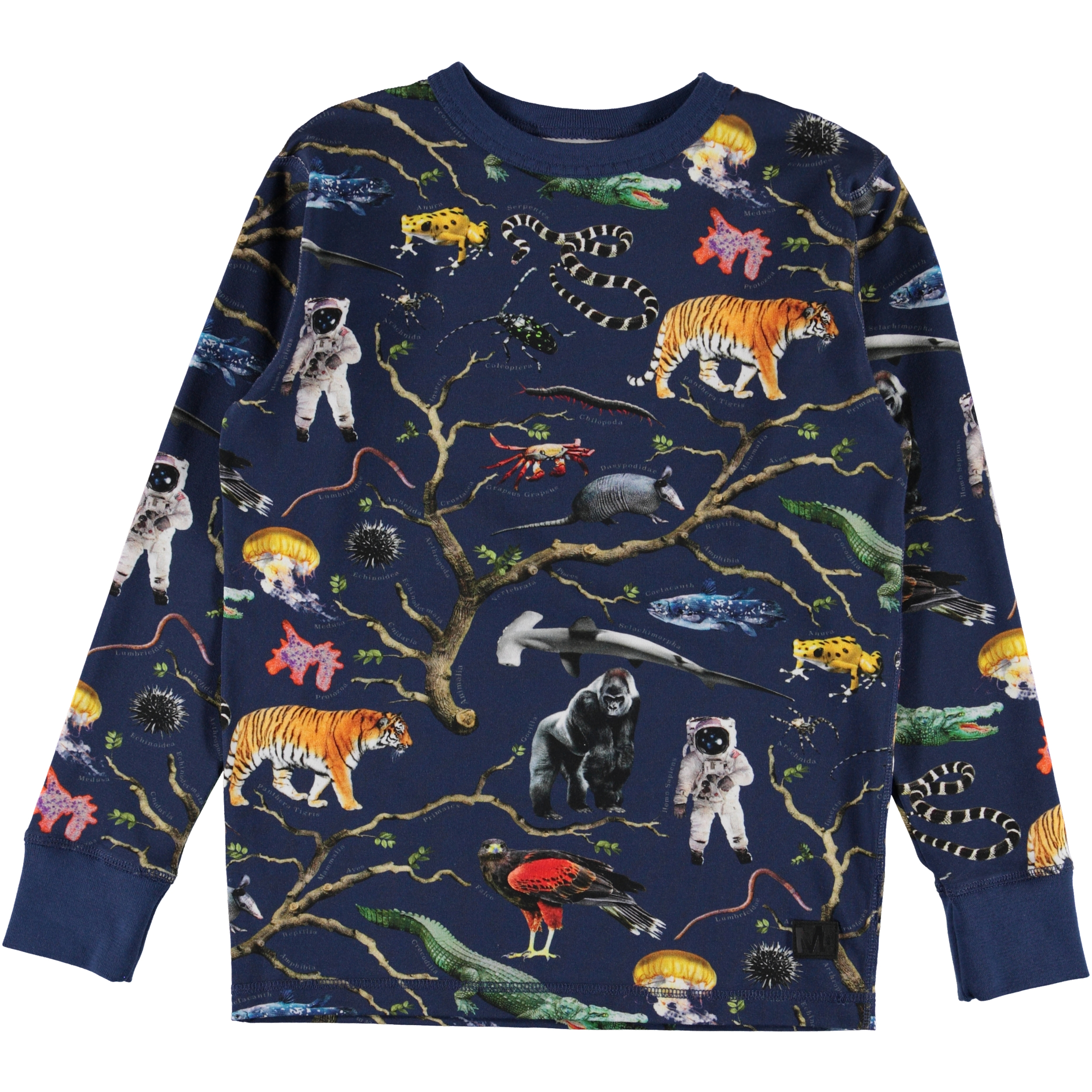 Verken de 'Tree of life' op het shirt van Rill. In de print staan aliens en wilde dieren verborgen. Het shirt is blauw en heeft lange mouwen.