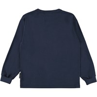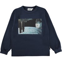 Rin is een donkerblauwe sweater met een print van satellieten in de ruimte.