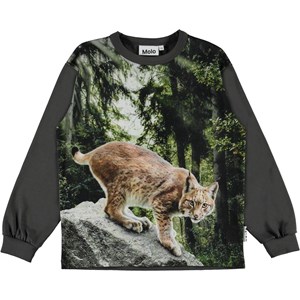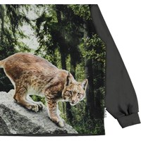 Rin is een groene shirt met lange mouwen en een print van een lynx op een klif in het bos.