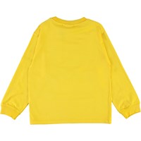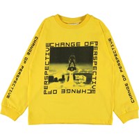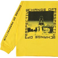 Rin is een gele sweater met een futuristische print op de voorkant en een gedrukte tekst met de tekst 'Change of Perspective' op de mouwen en voorkant.