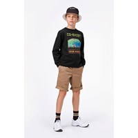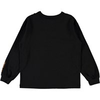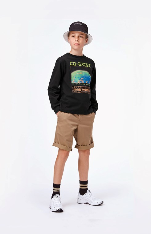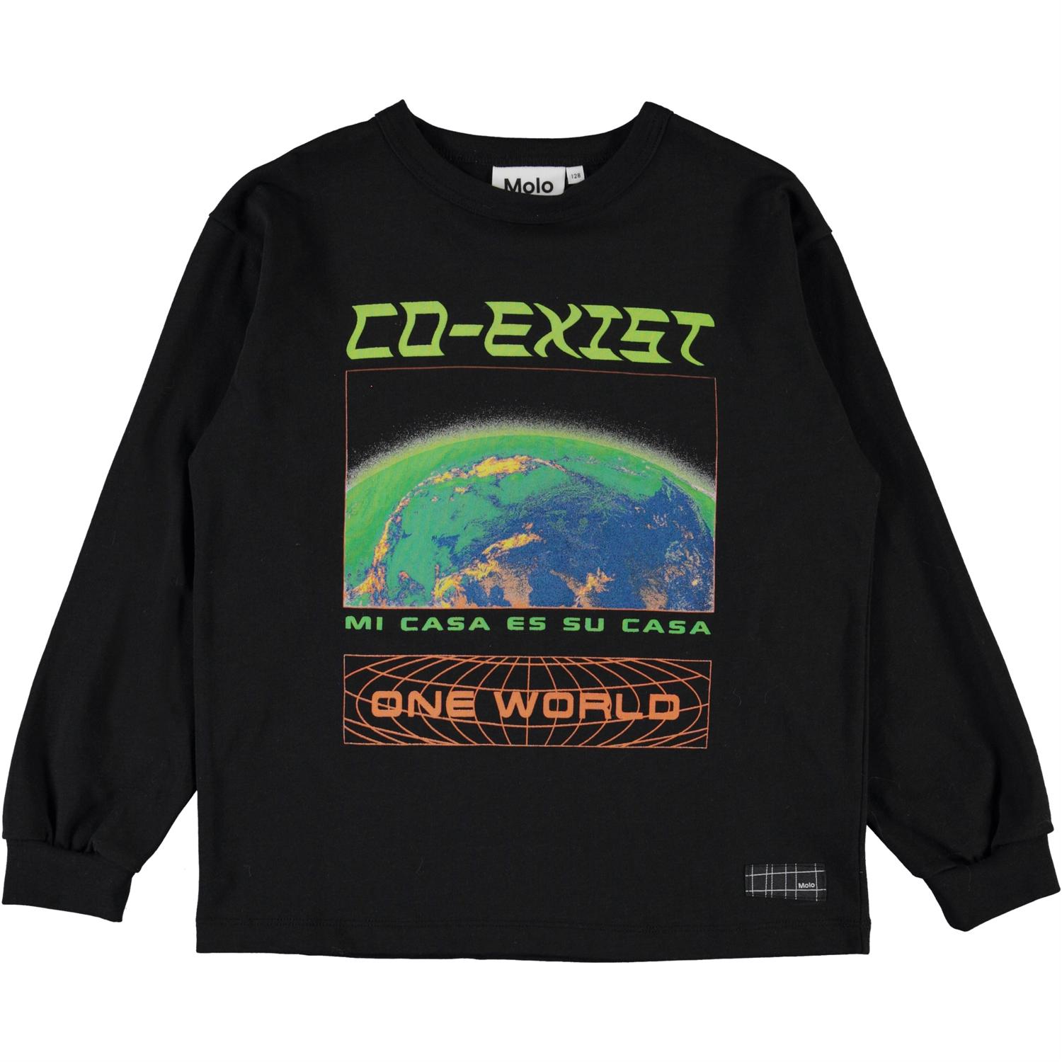 Rin is een zwarte sweater met een print van planeet Aarde en de tekst 'One world' en 'Co-exist'.