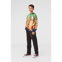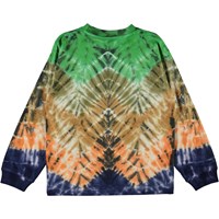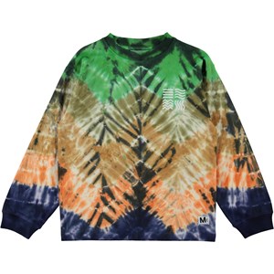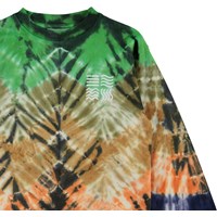 Rin is een shirt met lange mouwen en een tie-dye zigzag print met blauw aan de onderkant en groen aan de bovenkant.