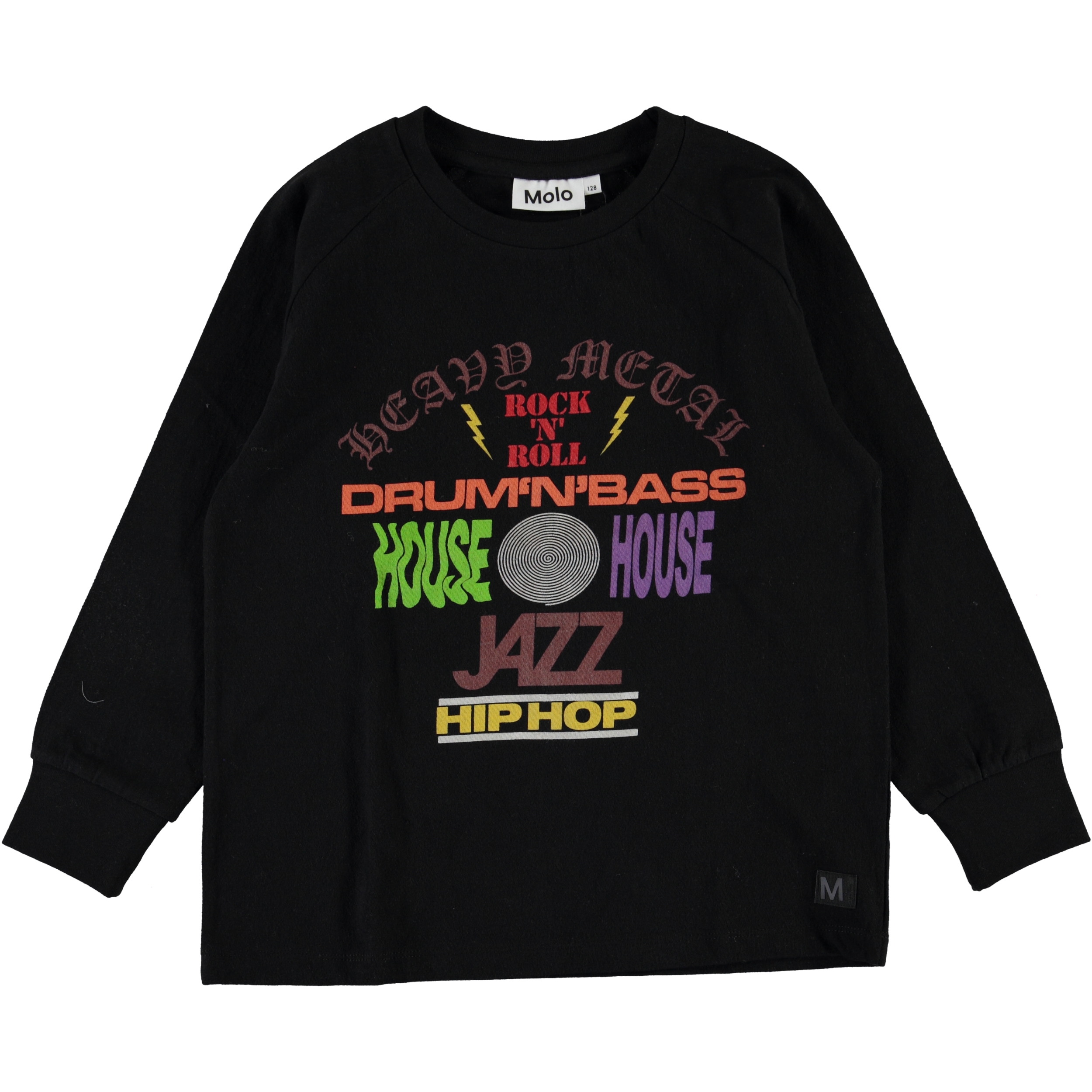 Ring is een zwarte shirt met lange mouwen en een print van verschillende muziekgenres op de voorkant. Ring is 100% katoen.