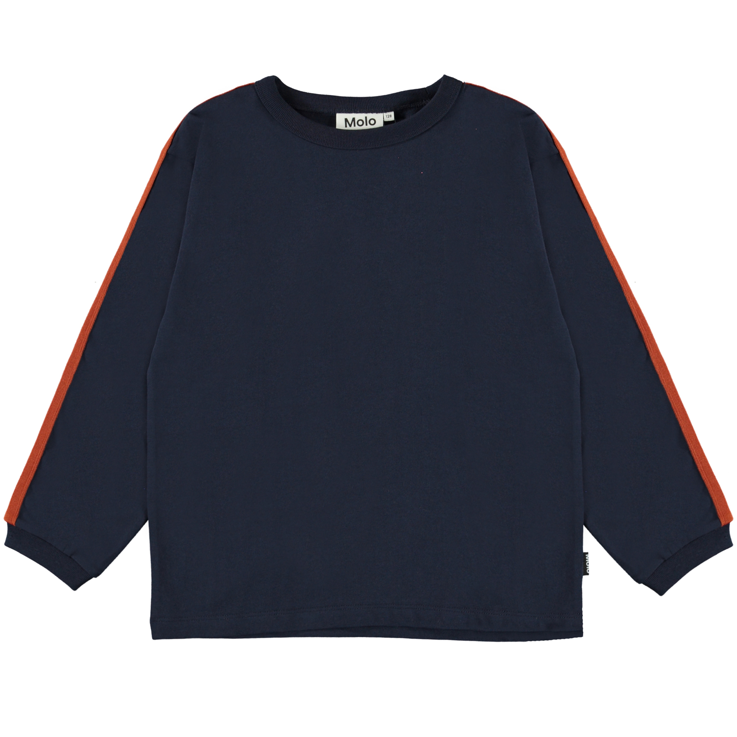 Rinny is een donkerblauwe sweater met strepen op de mouwen.