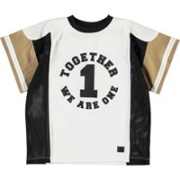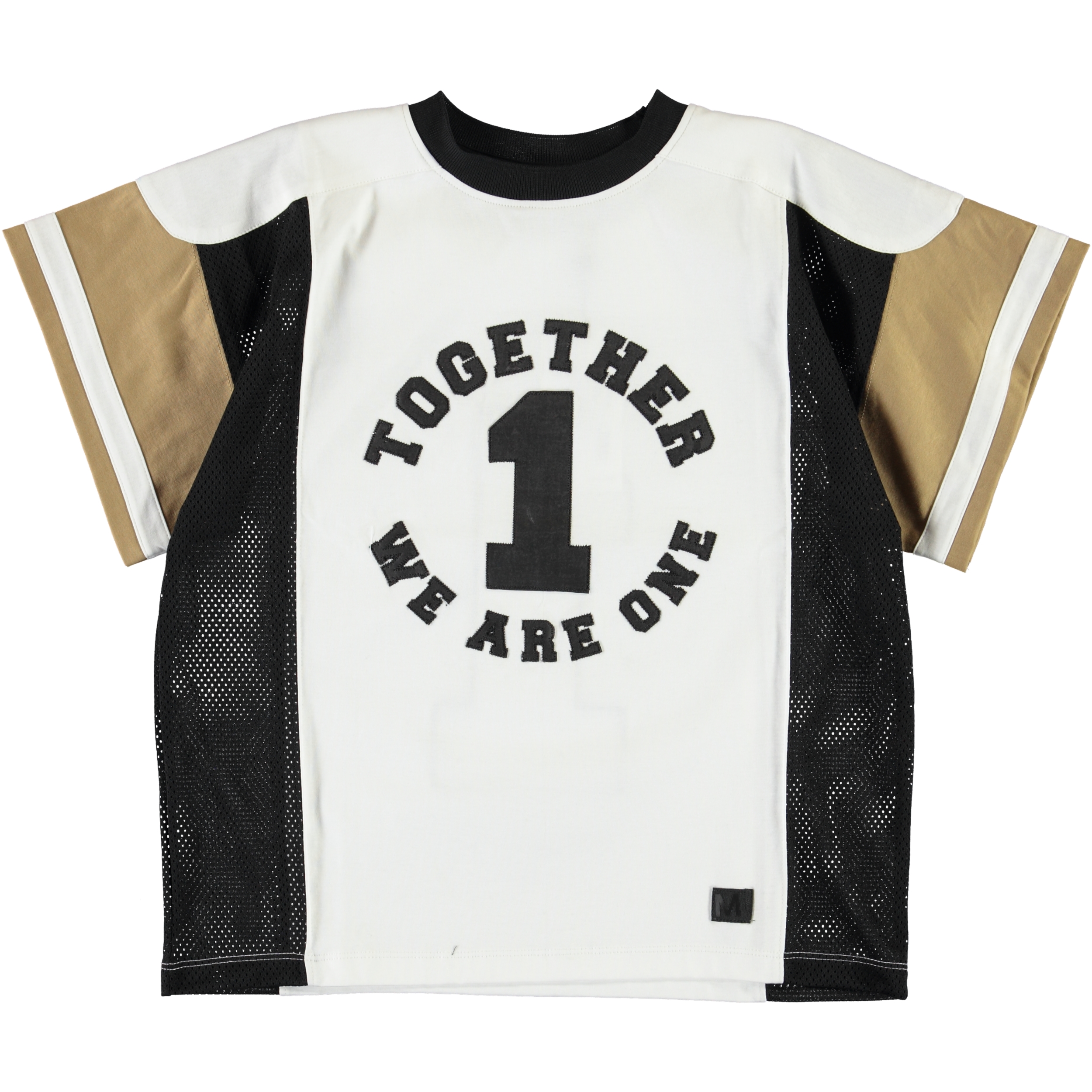 Ritter is een zwart en wit t-shirt met sportreferenties. Ritter heeft een ruimvallende pasvorm en heeft "Together we are 1" op de voorkant gedrukt.