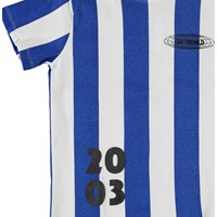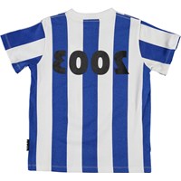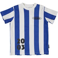 Road is een t-shirt met brede blauwe en witte verticale strepen dat een retro gevoel geeft.