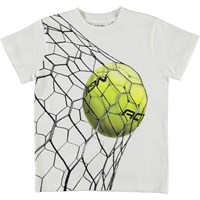 Road is een wit t-shirt met een print van een groene voetbal die net het net is ingevlogen.
