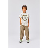 Road is een gebroken wit t-shirt met een print van de levenscyclus van een kikker, van kikkerdril tot kikkervisje tot kikker.