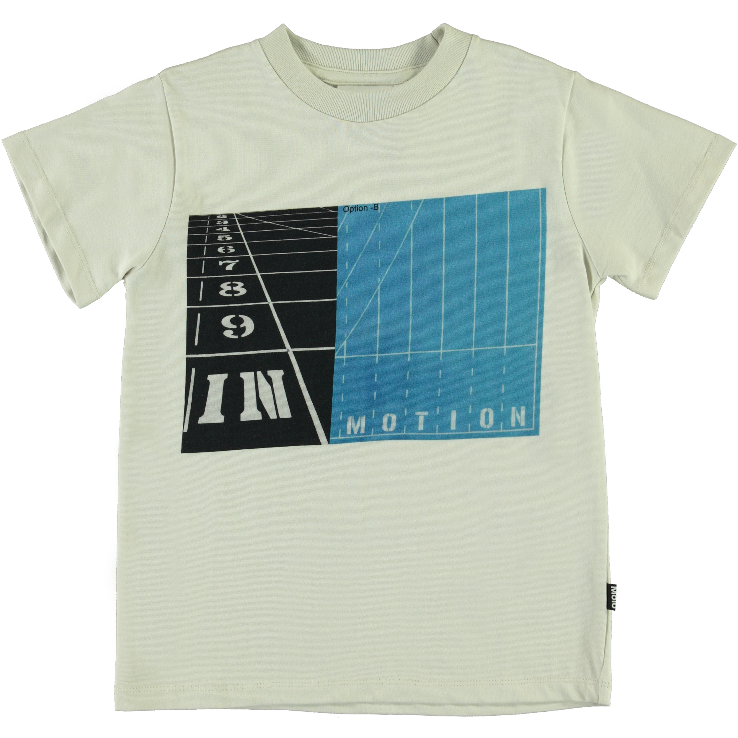 Road is een wit t-shirt met een sportprint op de voorkant, geïnspireerd op de Olympische Spelen, die Molo viert in deze collectie.