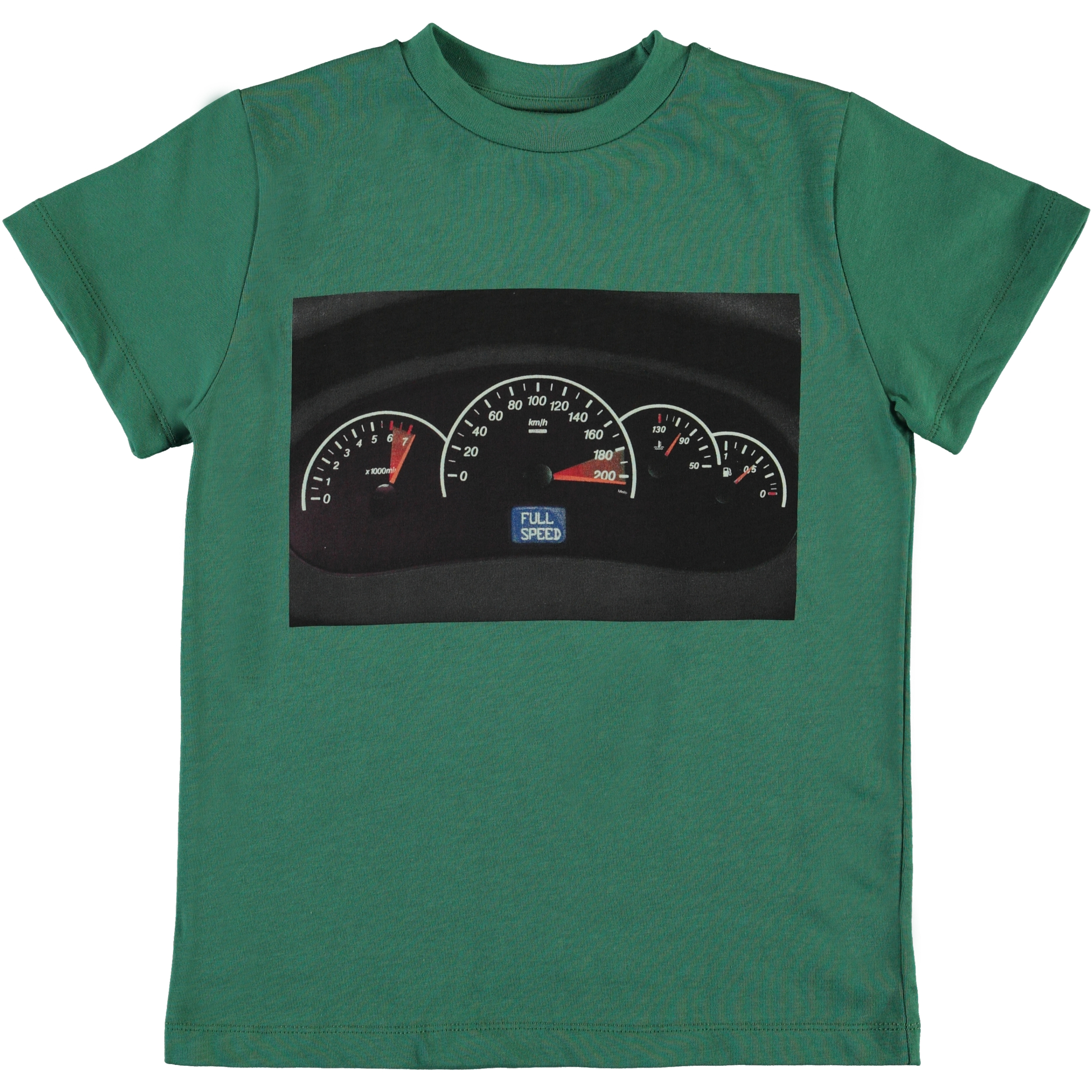 Road is een groen t-shirt met 'full speed' op de voorkant.