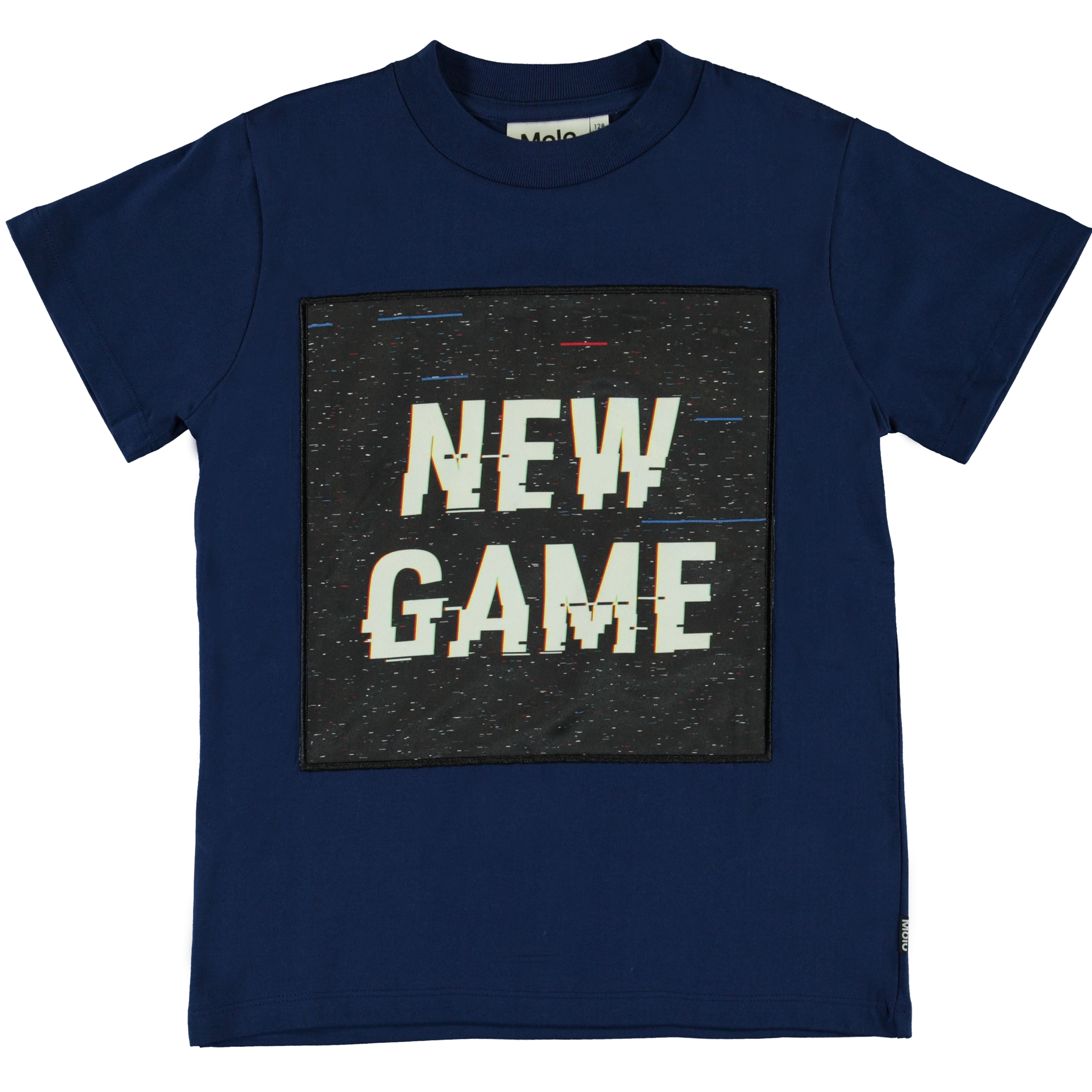 Road is een blauw t-shirt met opgenaaide print met de tekst 'New Game'.
