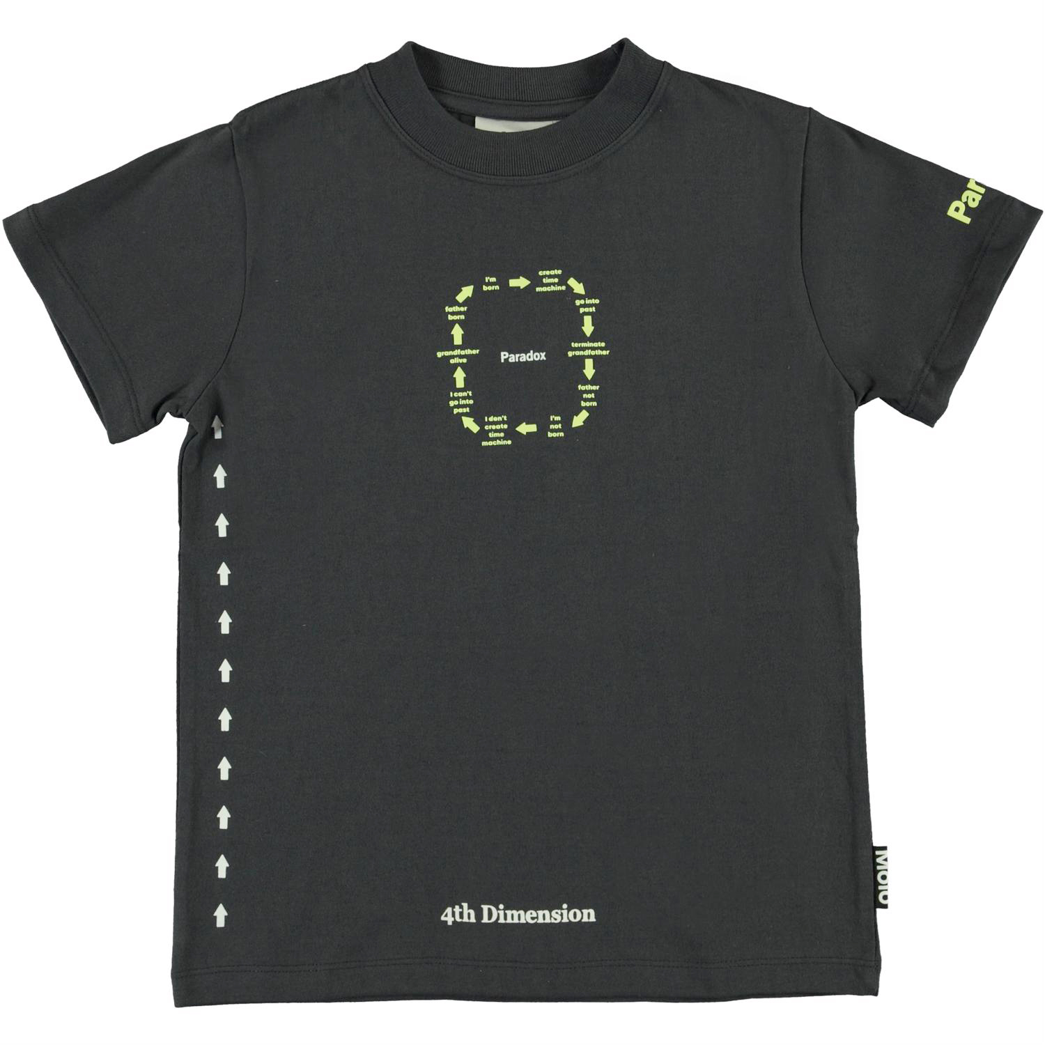 Road is een zwart t-shirt met de tekst ‘The grandfather paradox’ op de voorkant, die gaat over terug reizen in de tijd en welke consequenties dat zou hebben. Het t-shirt heeft ook een print op de achterkant en mouwen.
