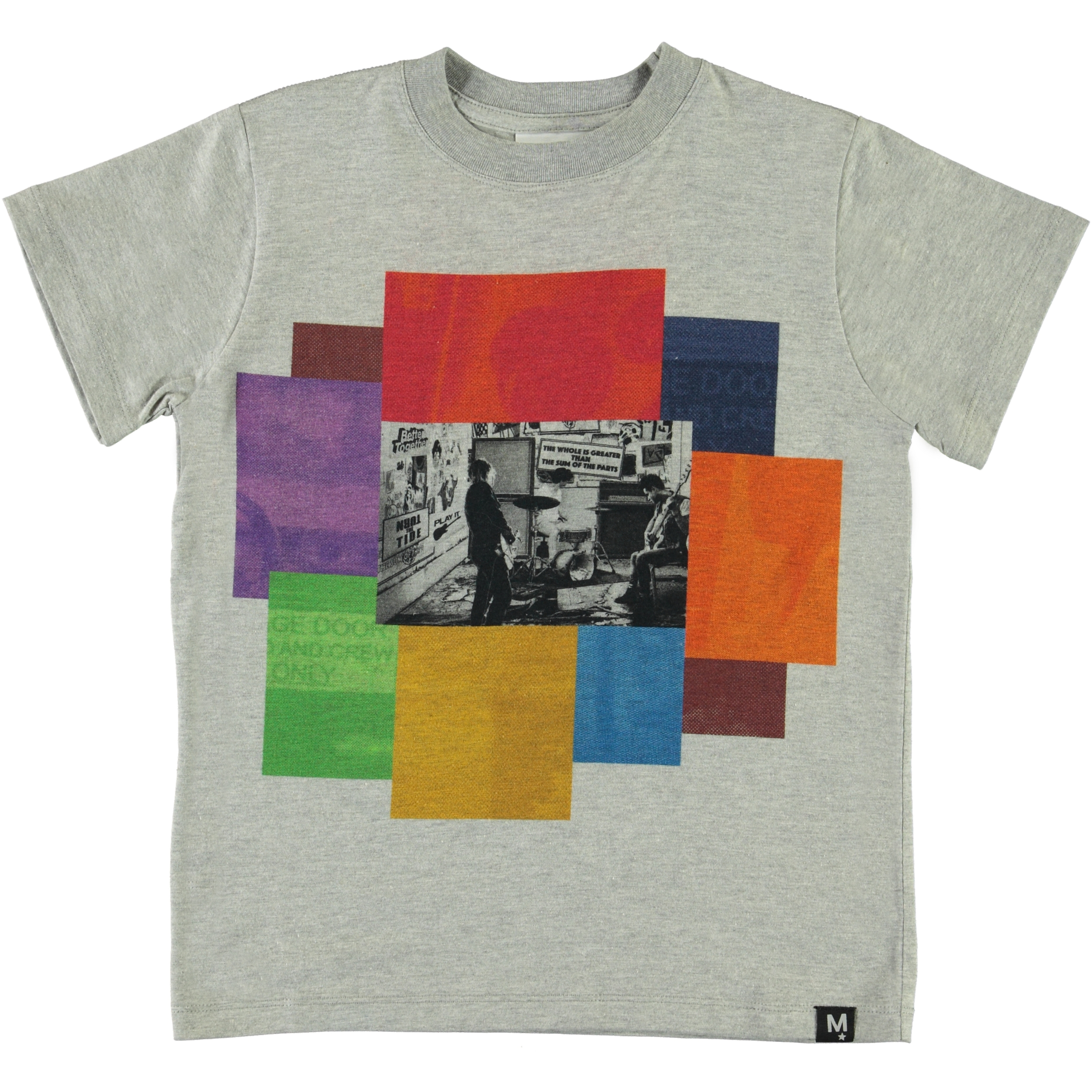 Road is een grijs t-shirt met een kleurrijke patchwork en muziekprint. Road is van 100% katoen en heeft korte mouwen.