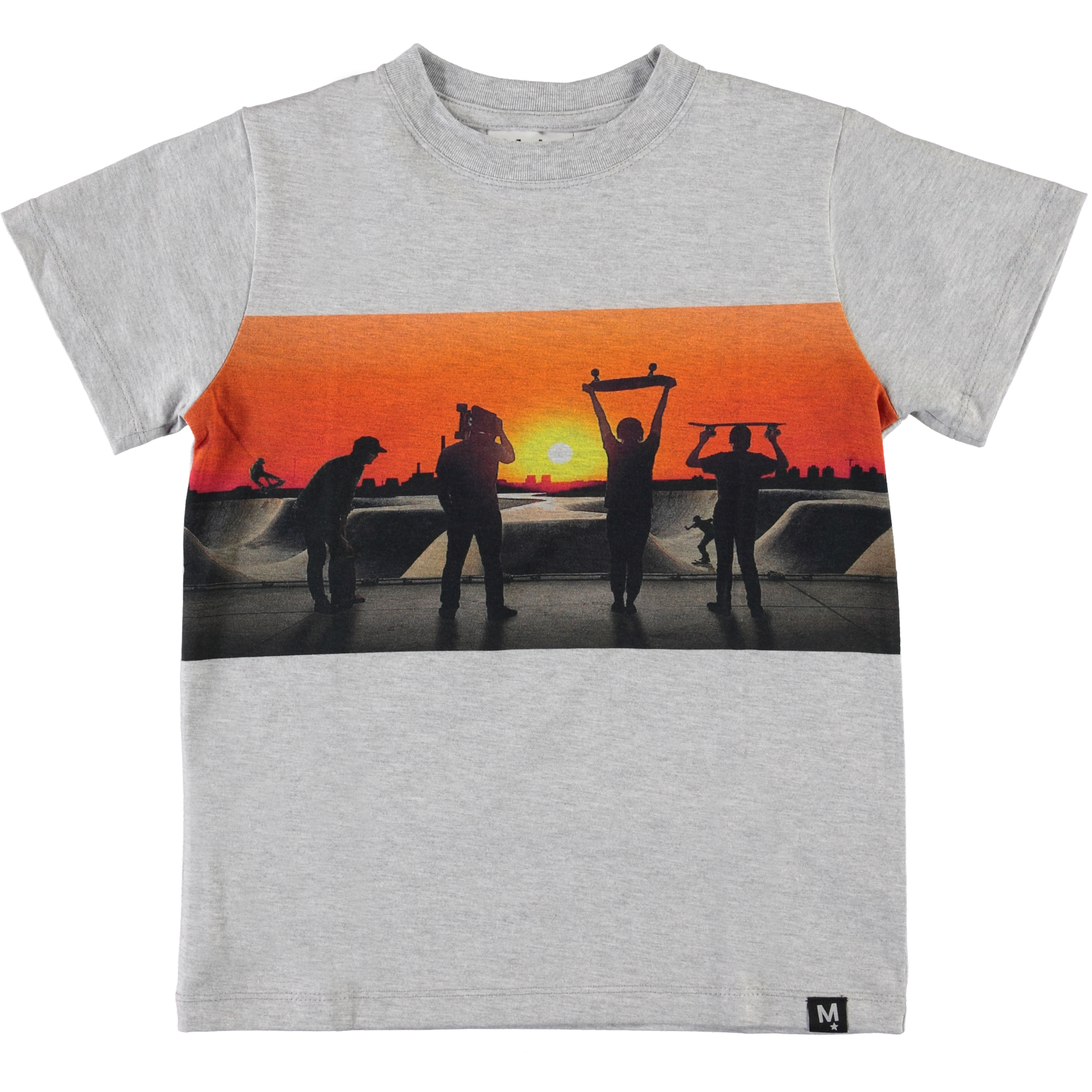Road is een grijs t-shirt met een print van een zonsondergang en een groep skateboarders. Road is van 100% katoen en heeft korte mouwen.