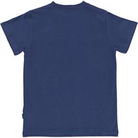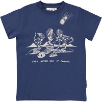 Road is een blauw t-shirt met een humoristische print van dinosaurussen die foto's maken van hun skeletten terwijl een meteoor hun kant op komt.