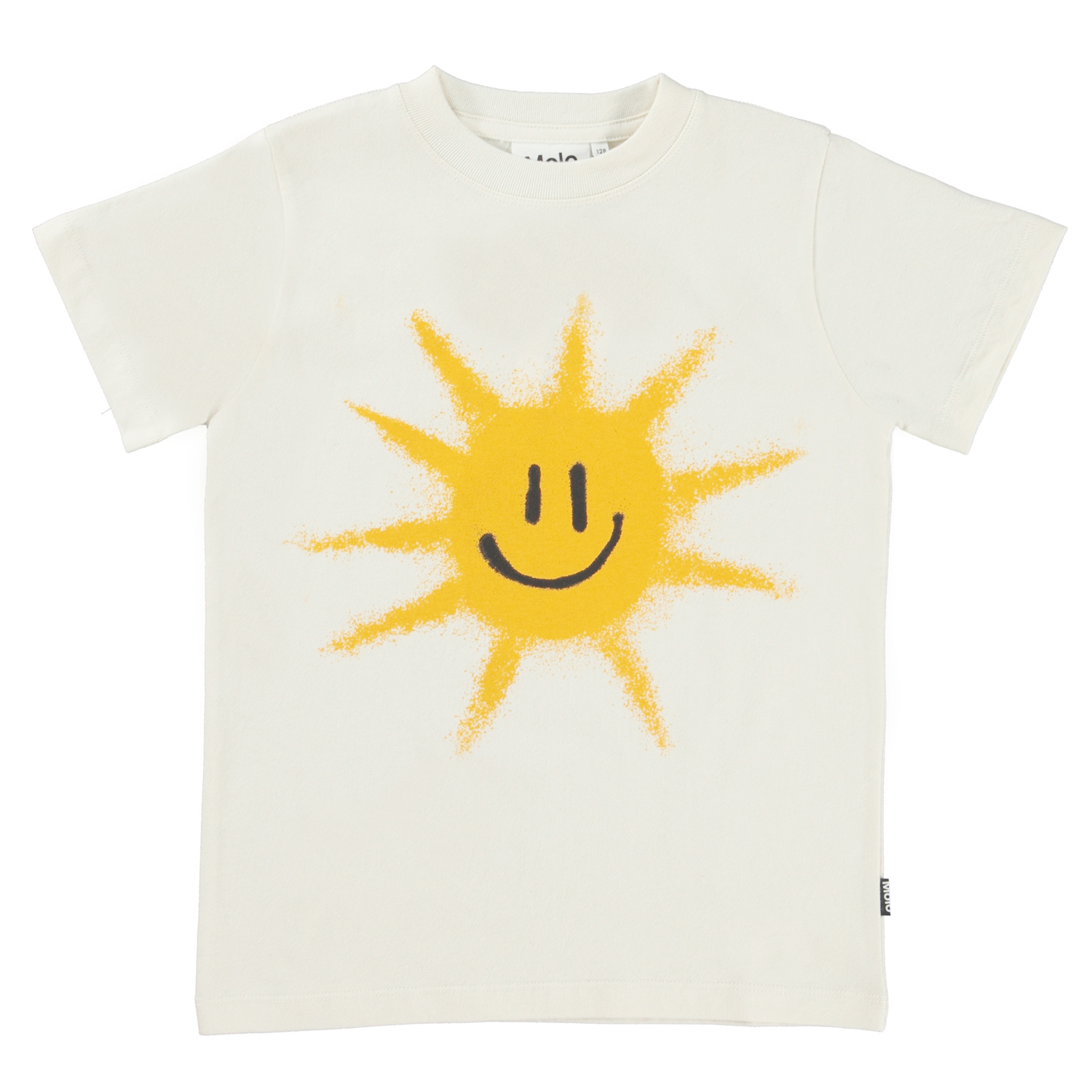 Road is een wit t-shirt met op de voorkant een print van een lachende zon.