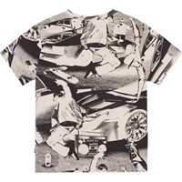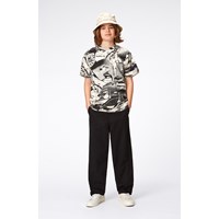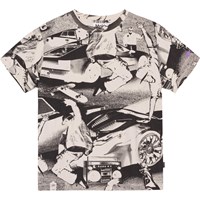 Rodney is een t-shirt van 100% biologisch katoen met een zwarte print. De print is een tweekleurige abstracte print die een straat vol breakdancers en auto's laat zien. Eén mouw heeft een kleine paarse print met de woorden 'On Fire'. Rodney heeft een ronde hals met rib en een ruimvallende pasvorm. Als je een meer klassieke pasvorm wilt, of als je kind tussen twee maten in zit, raden we je aan een maat kleiner te kiezen dan normaal.