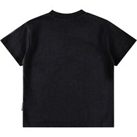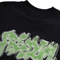 Zwart t-shirt gemaakt van zacht biologisch katoen met een ribboord rond de hals . Het t-shirt heeft een oversized pasvorm met op de voorkant de tekst "Vrijheid" gemaakt met een unieke borduurtechniek.
