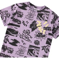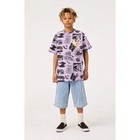 Paars t-shirt van biologisch katoen met korte mouwen en ribboord rond de hals. Het t-shirt heeft een ruimvallende pasvorm met een zwarte all over print van de thema's uit de collectie: aliens, krachten van de natuur, surfen, bananen, vrede, etc.