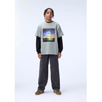 Grijze t-shirt gemaakt van zacht biologisch katoen met een ribboord rond de hals. De t-shirt heeft een oversized pasvorm met op de voorkant een print van een UFO die oplicht boven de daken.