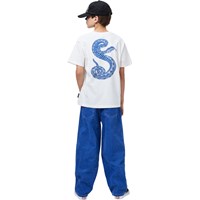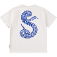 Wit T-shirt van biologisch katoen met een ribboord rond de hals. Het T-shirt heeft een ruimvallende pasvorm met een blauwe print van een cobra.
